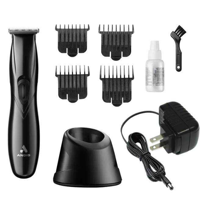 Kit includes: 4 combs (1/16", 1/8", 1/4", 3/8"), oil bottle, blade brush, adapter, charging stand.