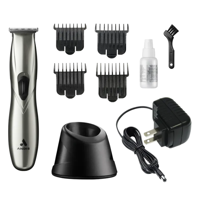Kit includes: 4 combs (1/16", 1/8", 1/4", 3/8"), oil bottle, blade brush, adapter, charging stand.