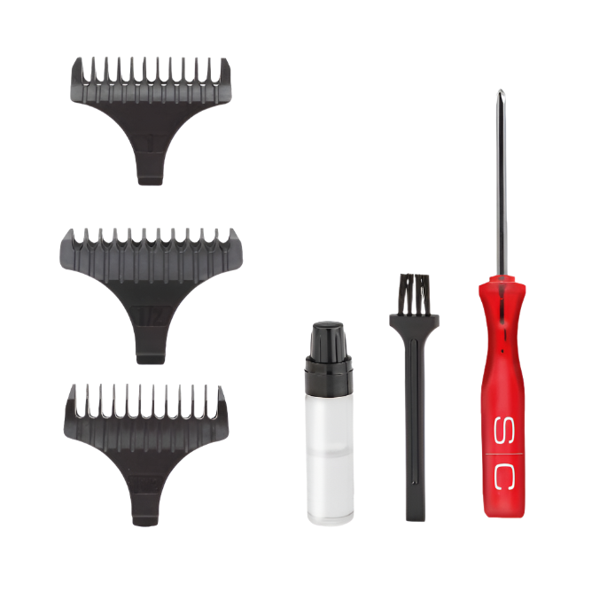 Includes: 3 guards, micro-USB charging cord, mini screwdriver, cleaning maintenance kit, charging stand, and zero-gap setting tool.
